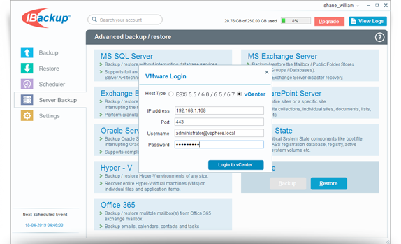 IBackup's VMware backup is an easy, secure and one of the most reliable solutions to backup virtual machines of any size with incremental backups.